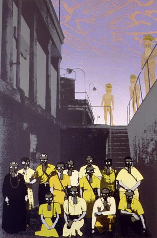 gray scarf around neck, & his bare arms are littered with Egon Schiele-jigsaw-tattoos-designed-70s-